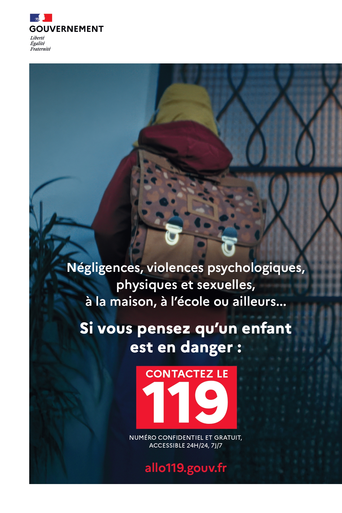 « Négligences, violences psychologiques, physiques ou sexuelles, à la maison, à l’école ou ailleurs, si vous pensez qu’un enfant est en danger : contactez le 119 »